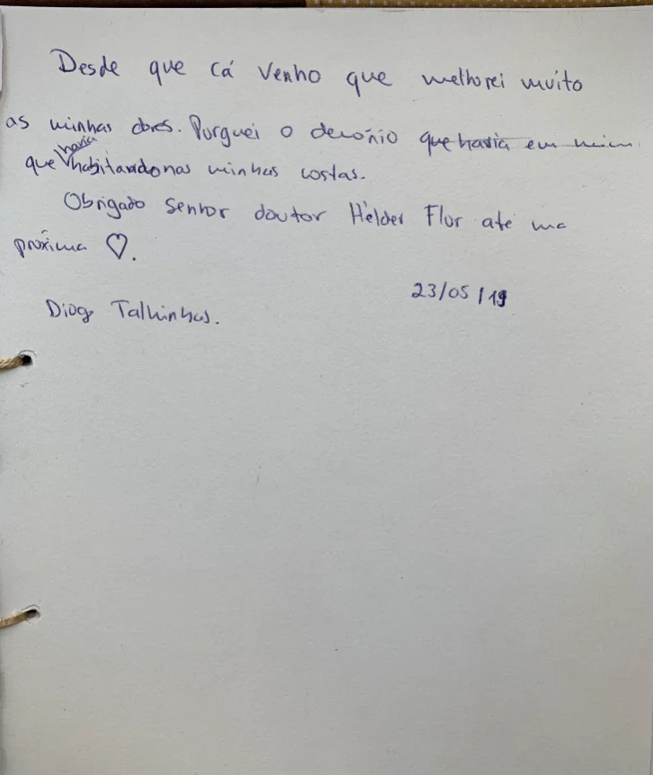 Desde que cá venho que melhorei muito das minhas dores. Purguei o demónio que havia habitando nas minhas costas.