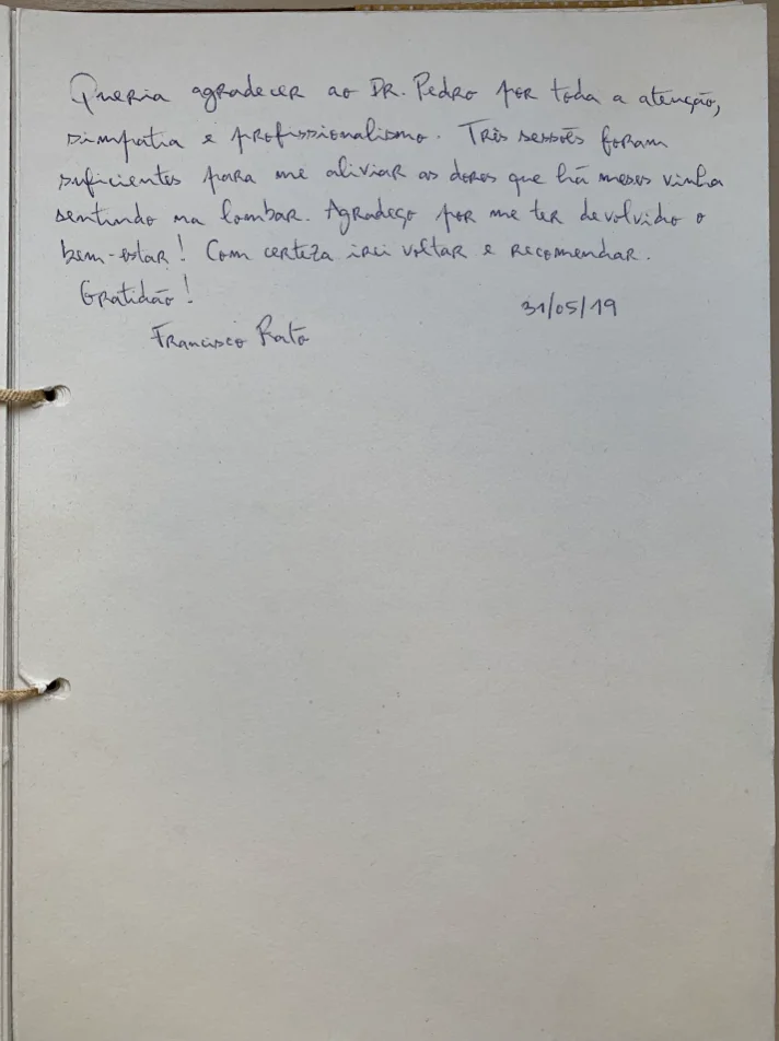 Queria agradecer ao Dr. Pedro por toda a atenção, simpatia e profissionalismo. Três sessões foram suficientes para me aliviar as dores que há meses vinha sentindo na lombar.