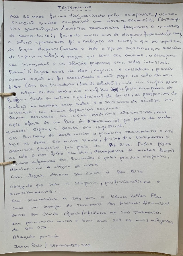 Foram 3 longos anos de dor, angústia e ansiedade, período durante o qual me foi aconselhado a não pegar ao colo o meu filho (dias sem brincadeira / dias de solidão), onde um simples gesto de calçar ou dar banho ao meu filho se fazia acompanhar de lombalgia. Sendo eu militar e profissional de saúde, as perspectivas de evolução na carreira eram nulas e o sentimento de revolta era constantes, com humor deprimido e contínuo. Estava reticente em iniciar medicina alternativas, mas após oferta de um pack de 5 tratamentos por parte da minha querida esposa, a recusa era impossível. Em Fevereiro de 2019 iniciei o primeiro tratamento e até hoje as dores são muito ténues, fruto dos tratamentos e exercícios propostos por parte da Dra. Rita. Poder pegar ao colo o meu filho sem dor, desempenhar as minhas funções enquanto enfermeiro sem limitações e poder praticar desporto, devolve-me a alegria de viver.