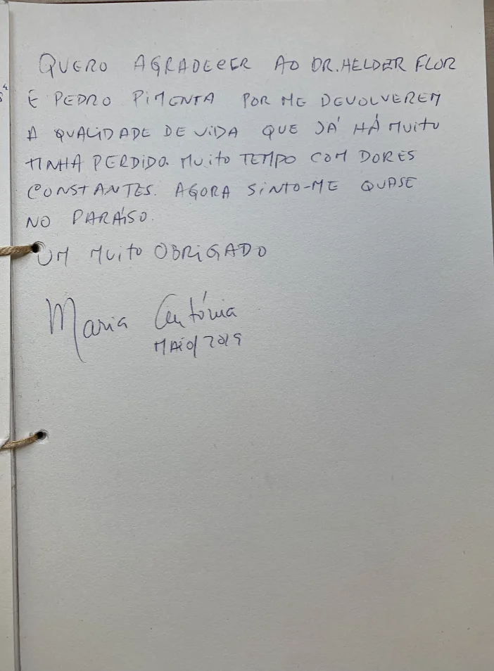 Quero agradecer ao Dr. Helder Flor e Pedro Pimenta por me devolverem a qualidade de vida que já há muito tinha perdido. Muito tempo com dores constantes. Agora sinto-me quase no paraíso.