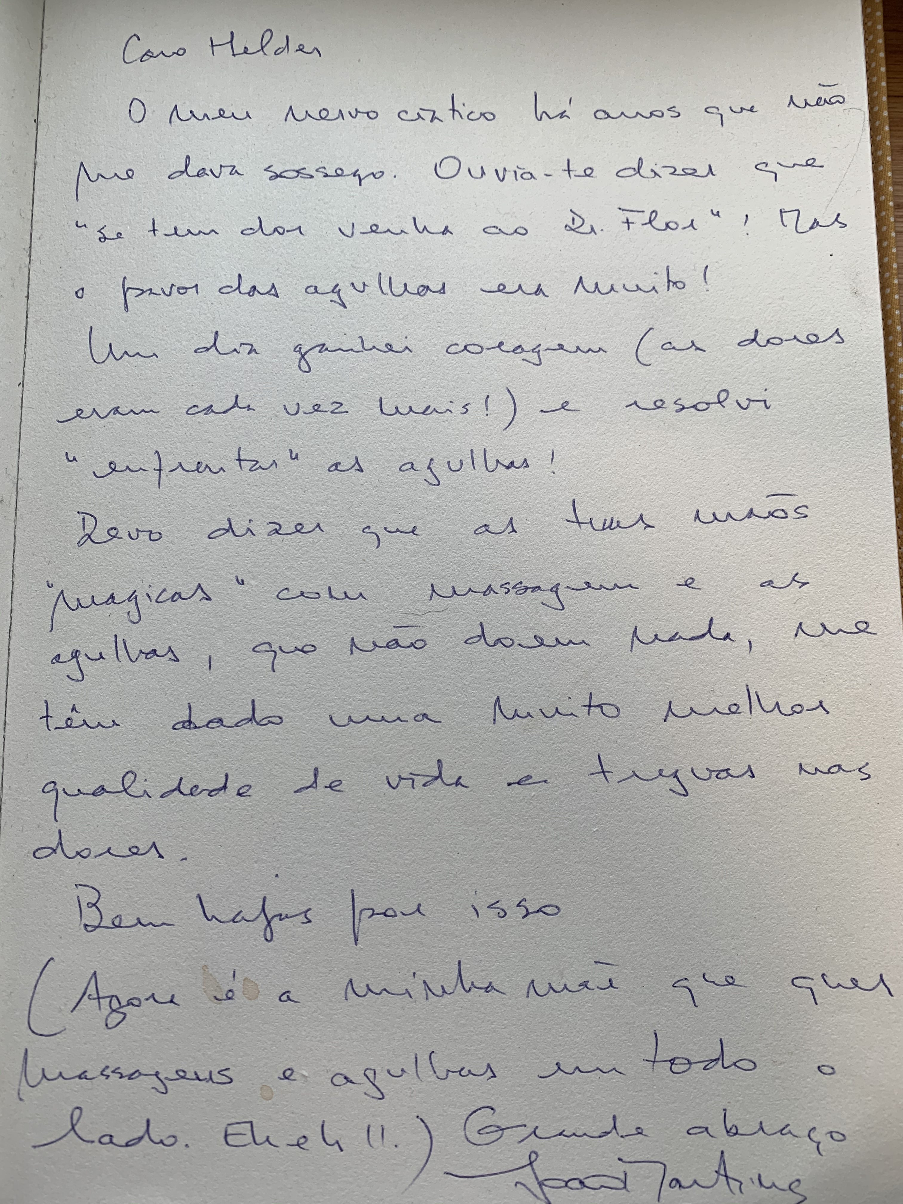 Devo dizer que as tuas mãos “mágicas” com massagem e as agulhas, que não doem nada, me têm dado muito melhor qualidade-de-vida e tréguas nas dores.